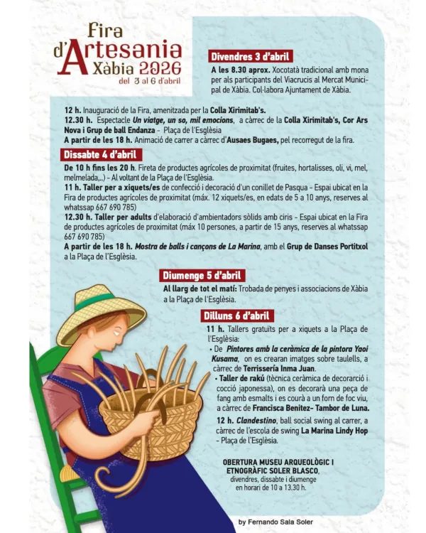 | 3-6 abr | Xàbia | Fira d’Artesania 2026 — Tallers, fireta, danses i swing (Plaça de l’Església) |