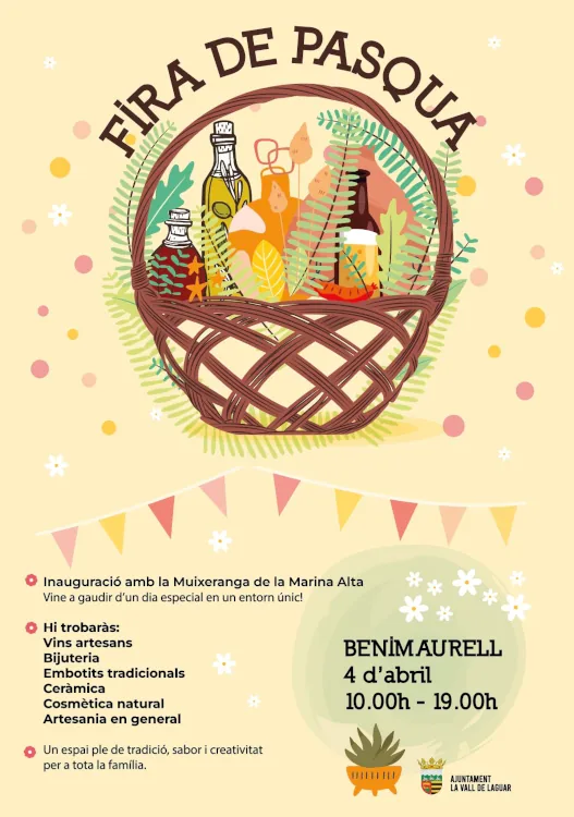 Al cor de La Vall de Laguar, el xicotet poble de Benimaurell celebra la seua Fira de Pasqua el dissabte 4 d’abril, de 10 a 19 h. La inauguració anirà acompanyada de la Muixeranga de la Marina Alta, i pels carrers trobaràs parades de vins artesans, bijuteria, embotits tradicionals, ceràmica, cosmètica natural i artesania en general. Un espai ple de tradició, sabor i creativitat per a tota la família, en un entorn únic als peus de la serra del Cavall Verd.