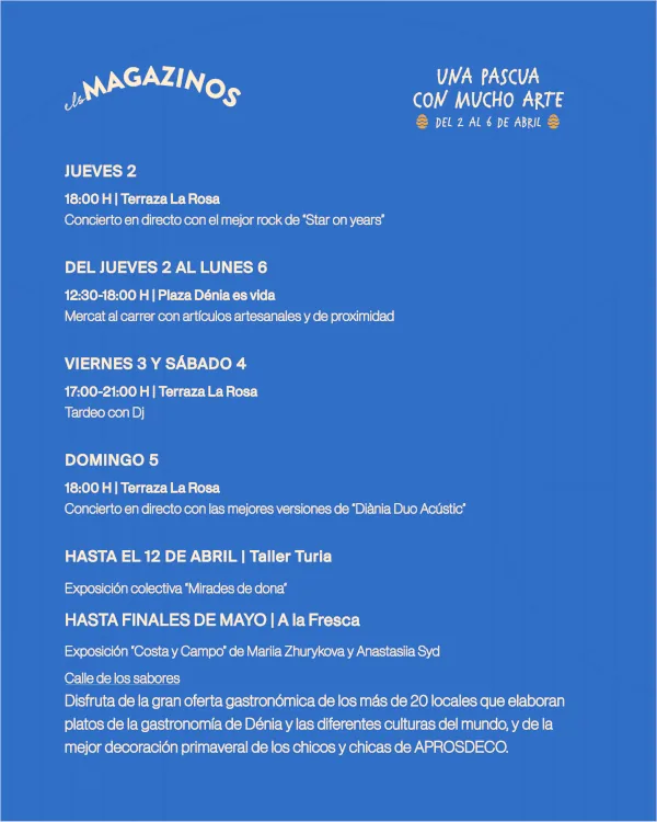 | 2-6 abr | Dénia (Els Magazinos) | “Una Pascua con mucho arte” — Concerts, mercat artesà, tardeo DJ i exposicions |