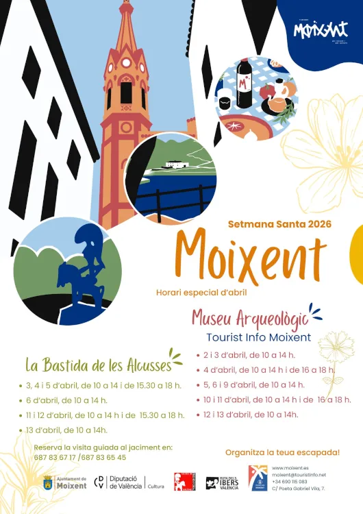 Moixent desplega un horari especial d’abril per a descobrir el seu tresor ibèric. El Museu Arqueològic – Tourist Info obri del 2 al 13 d’abril amb horaris ampliats els dissabtes (10-14 h i 16-18 h), i el jaciment de La Bastida de les Alcusses —un dels poblats ibèrics més importants del Mediterrani— ofereix visites guiades els dies 3, 4, 5, 6, 11, 12 i 13 d’abril (de 10 a 14 h, i de 15.30 a 18 h els dies de jornada completa). Reserves al 687 83 67 17 / 687 83 65 45.