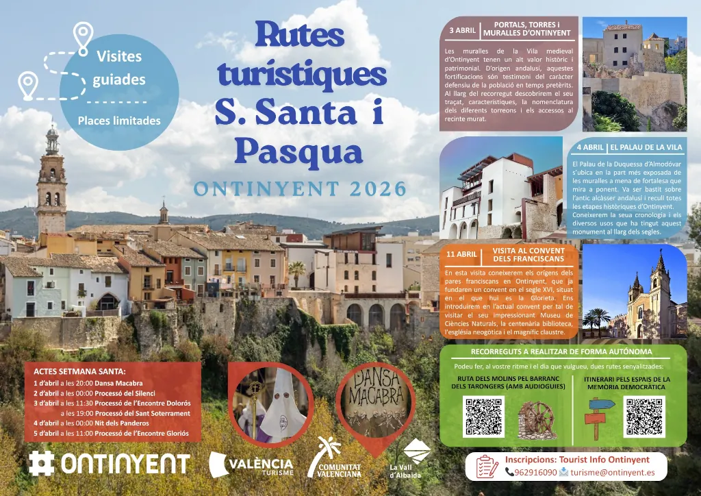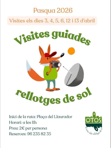 Otos, el poble dels rellotgers de sol, aprofita la Pasqua per a mostrar el seu patrimoni més singular. Els dies 3, 4, 5, 6, 12 i 13 d’abril s’ofereixen visites guiades als rellotges de sol del poble, amb inici a la Plaça del Llaurador a les 11 h. Preu: 2 € per persona. Reserves: 96 235 82 35. Una ruta diferent que et farà mirar el temps —literalment— d’una altra manera.